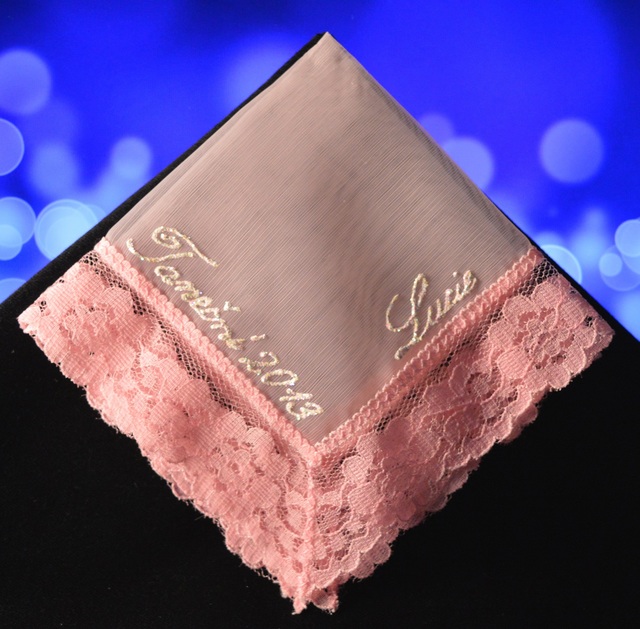 Krajkový kapesníček, růžový s růžovou krajkou s bílým třpytivým nápisem