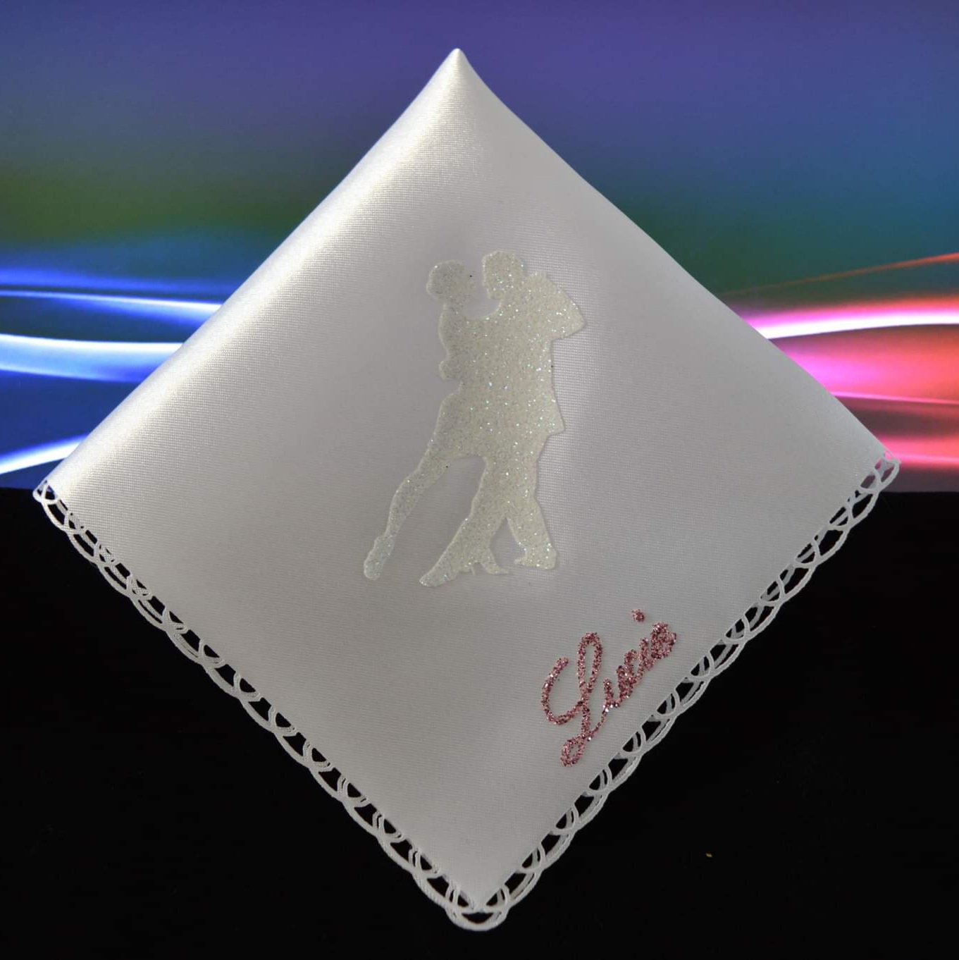 Bílý třpytivý taneční pár, růžový nápis