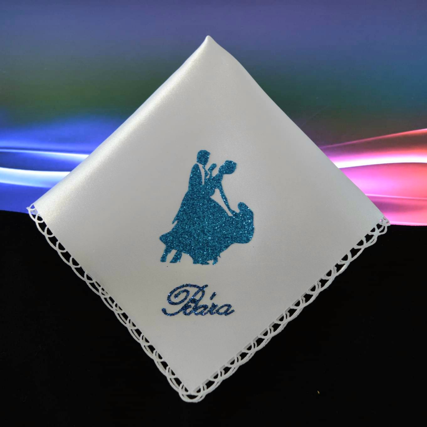 Saténový kapesníček, modrý třpytivý taneční pár a nápis.