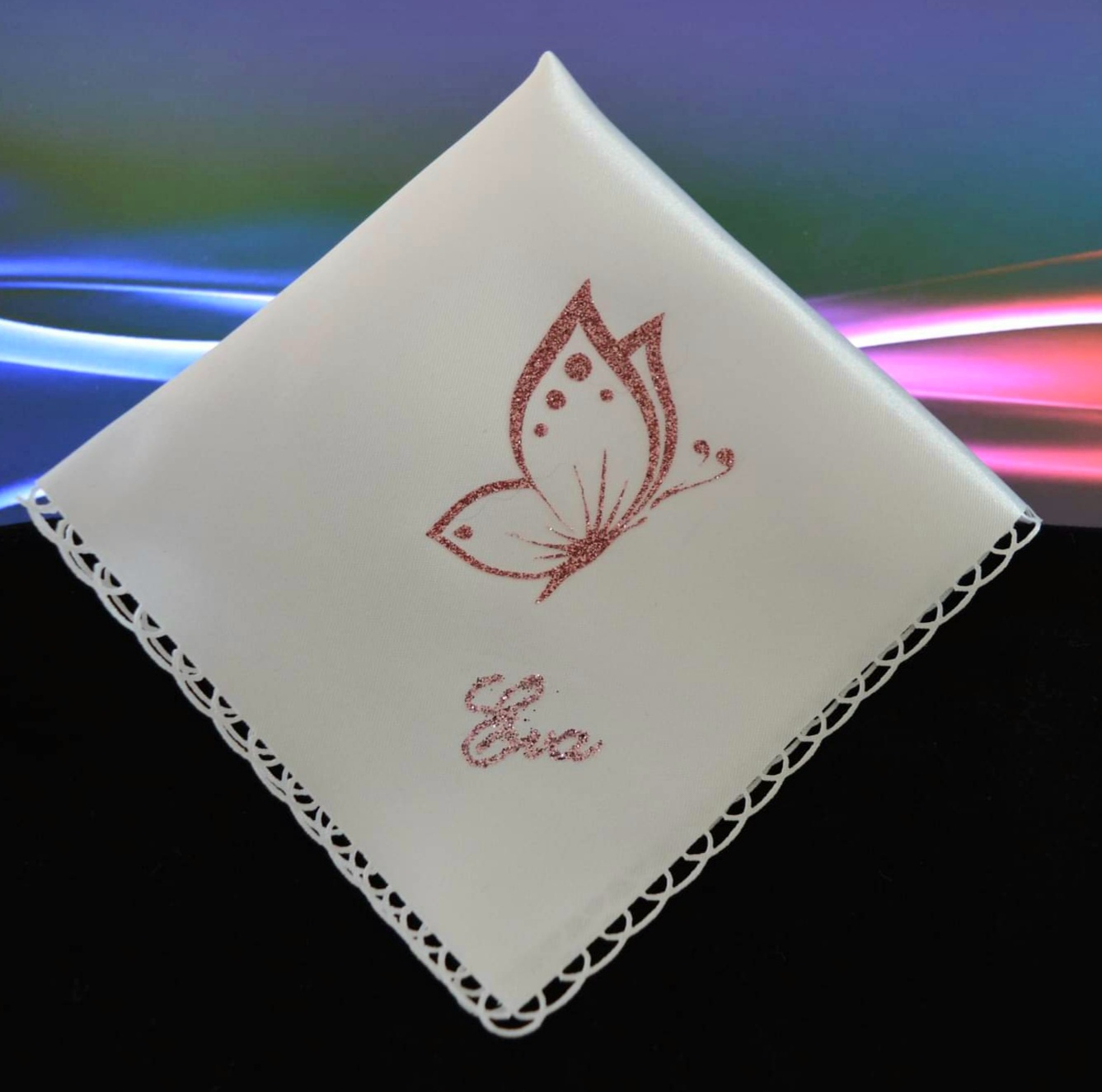 Saténový kapesníček, růžový třpytivý obrázek i nápis.